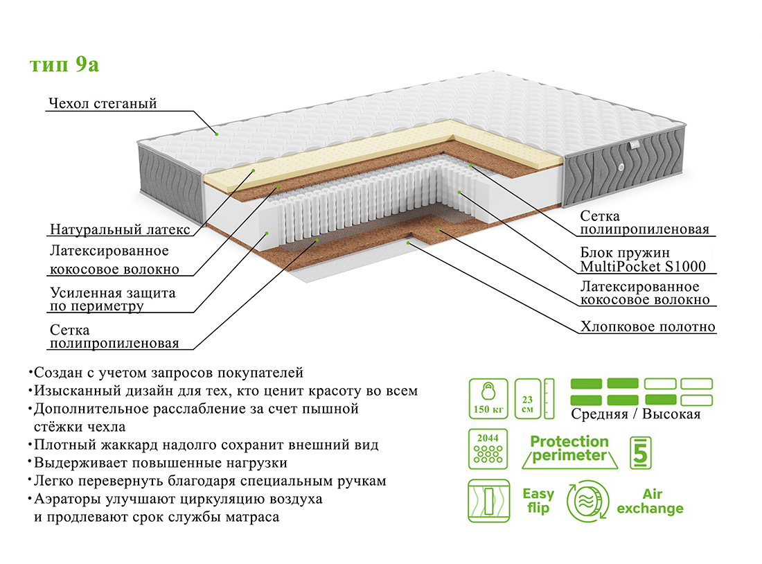 Мы исследовали запросы покупателей, и создали матрас, в котором учли всё! Матрас Тип 9а — это: