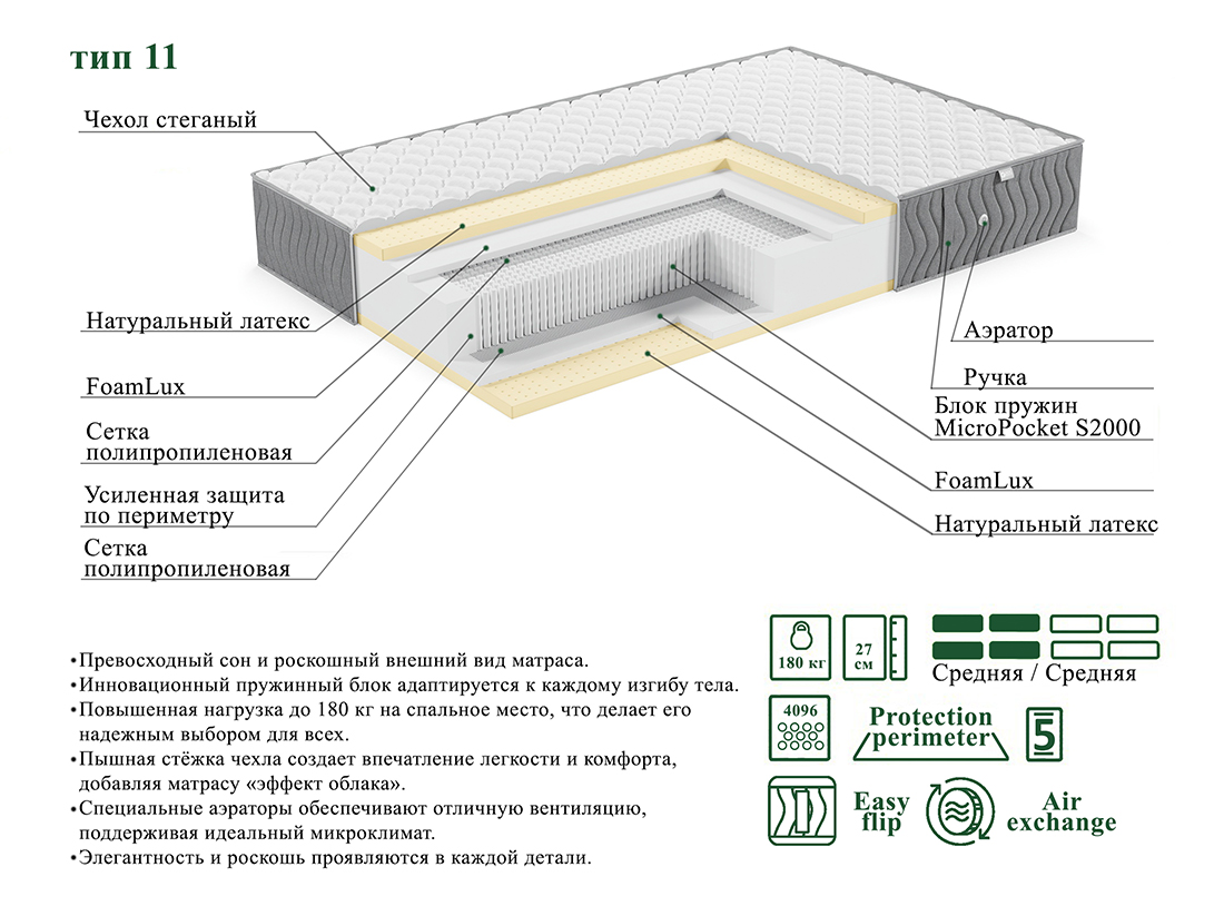 • Матрас оснащен инновационным пружинным блоком MicroPocket S2000 с 1024 пружинами на квадратный метр. Этот блок не только подстраивается под ваши контуры, но и реагирует на каждое движение, обеспечивая идеальную поддержку. С нагрузкой до 180 кг на спальное место.