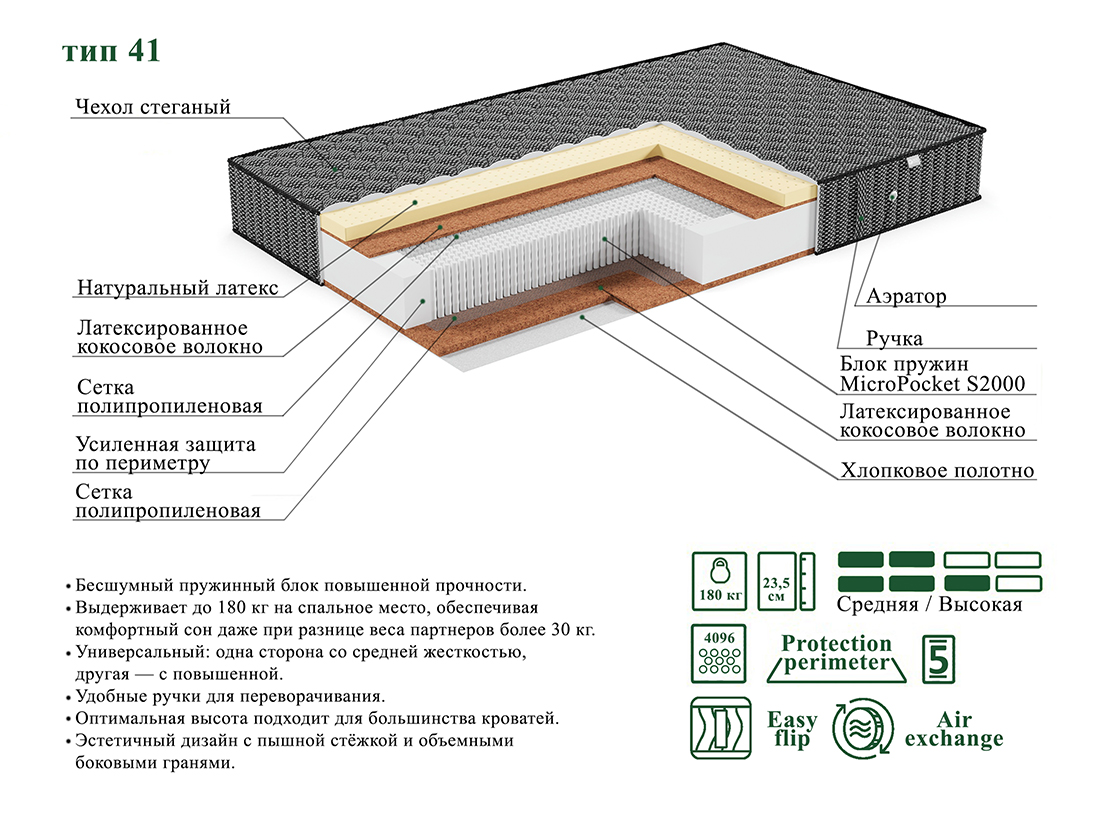 Инновационный пружинный блок MicroPocket S2000 с 1024 пружинами на квадратный метр. Этот блок не только подстраивается под ваши контуры, но и реагирует на каждое движение, обеспечивая идеальную поддержку. С нагрузкой до 180 кг на спальное место.