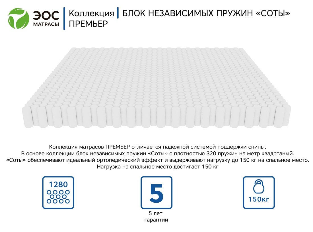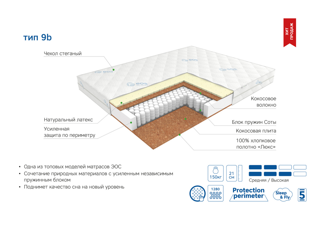 Матрас EOS Премьер 9b – это уникальное сочетание природных материалов с усиленным независимым пружинным блоком.